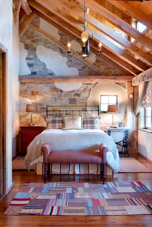 Layering raw wood with painted casegoods builds a collected, authentic atmosphere. Natural materials—from exposed beams to pale wood dressers—anchor the room and give it lasting warmth.