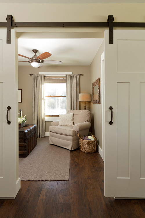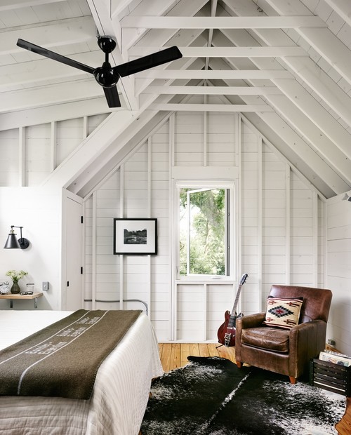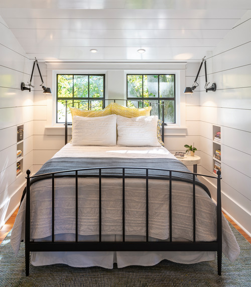 Use a slim bench or trunk at the foot of the bed for seating and storage in one. Consider a sliding barn door to save swing clearance and add subtle farmhouse character in tight layouts.