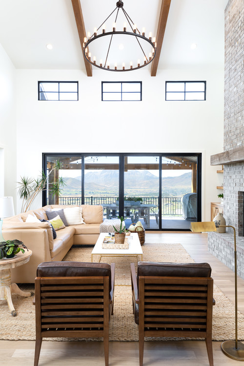 Consider placement carefully. Suspend a chandelier through exposed beams or mount spotlights between them. Wall sconces flanking a fireplace provide soft, ambient light and symmetrical interest.