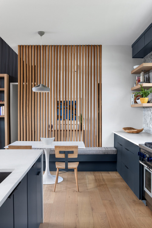 Use repetitive slats or paneling on an island to reinforce horizontal lines while adding low-key texture. A rhythmic granite backsplash with consistent joints plays a supporting role rather than competing for attention.