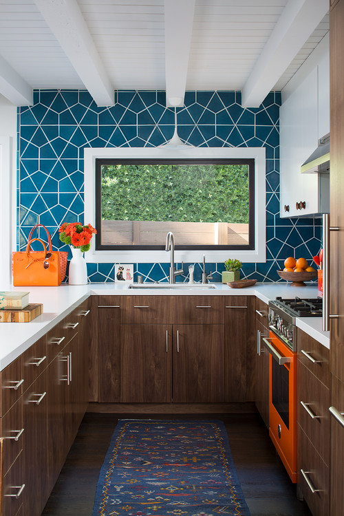 Introduce bright red, orange, or blue sparingly — a feature wall, stools, or a run of upper cabinets makes a bold nod to the 1960s without overwhelming the room.