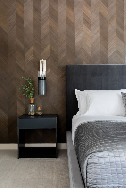 Choose designer-inspired wallpaper in restrained palettes. A Gucci motif behind a Roche Bobois bed feels fashion-forward without overpowering the space.