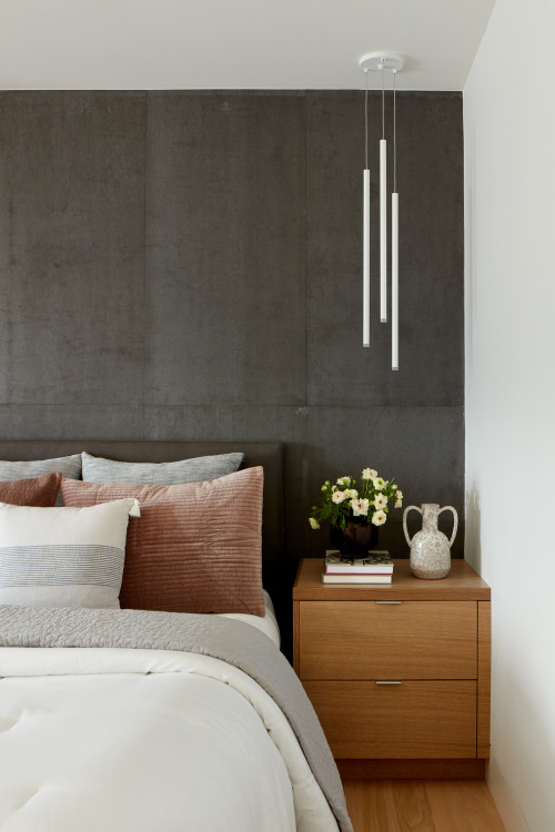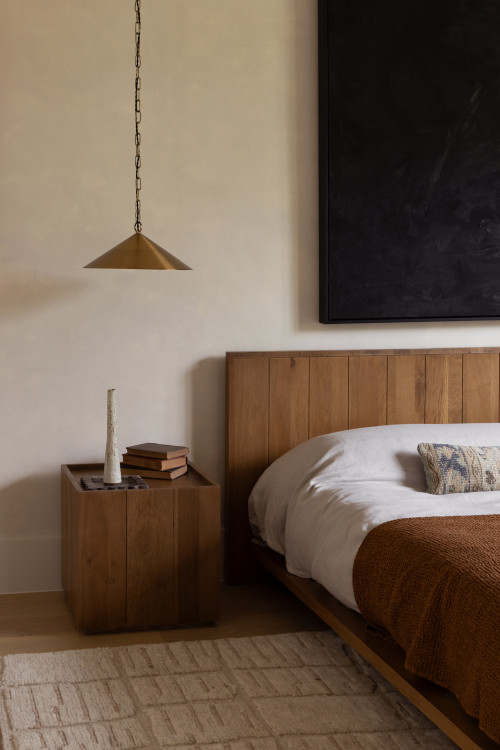 Position wood as the essential counterpoint to clean forms. Walnut touches on a bed frame or nightstands add depth and a subtle luxe note without heavy ornament.