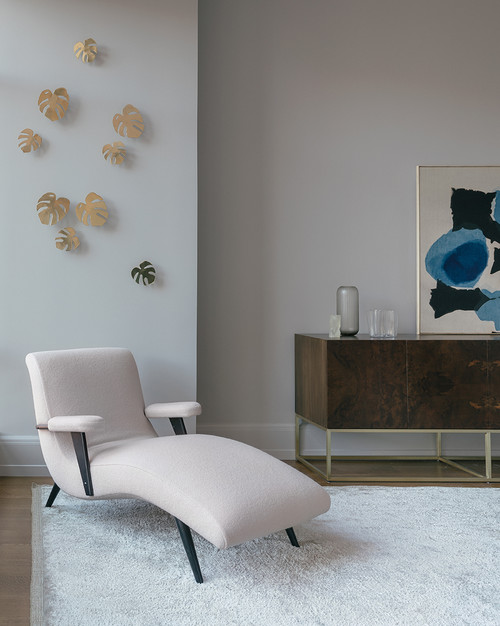 Install a single large-scale work or create an art-as-headboard moment to define the axis of the bedroom. A Marilyn Minter piece can turn a quiet scheme into a gallery-like statement.
