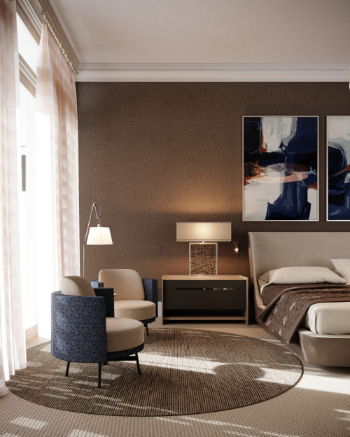 An upholstered bed or a canopied walnut frame anchors the room without needing many extra pieces. Think a velvet-covered canopy for enveloping comfort or a B&B Italia bed as a sculptural focal point.