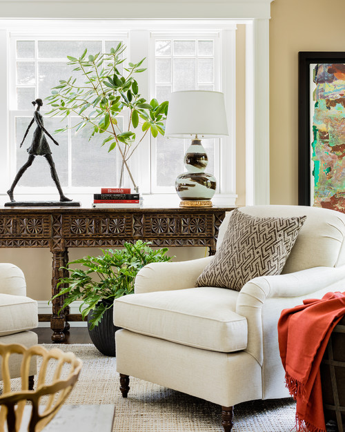 Decorative objects and collections can add personality to your transitional living room. Choose a few statement pieces, like an oversized mirror or a piece of abstract art, rather than cluttering the space with many small items.